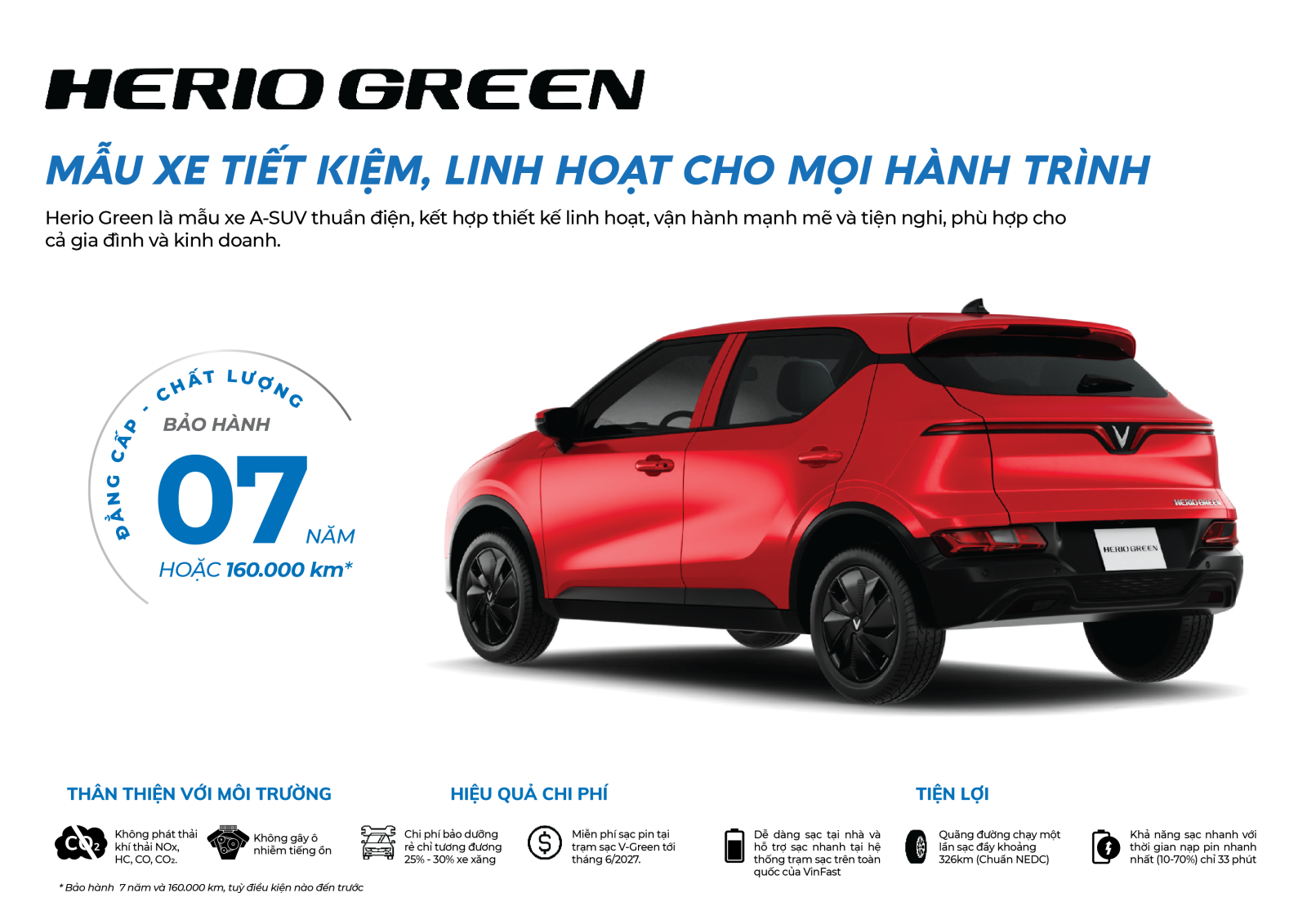 Herio Green là mẫu xe A-SUV thuần điện, kết hợp thiết kế linh hoạt, vận hành mạnh mẽ và tiện nghi, phù hợp cho cả gia đình và kinh doanh.